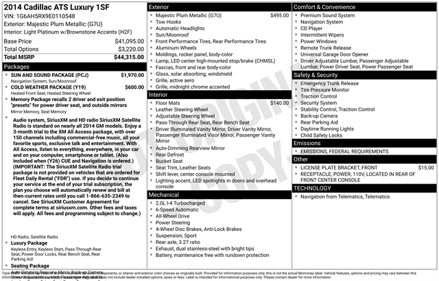 2014 Cadillac ATS 2.0L Turbo Luxury 4D Sedan **NAVIGATION**, **LOCAL TRADE IN**, **LEATHER**, **MOONROOF**, BLUETOOTH, ALL BOOKS AND KEYS, **REMOTE START**, **Back-Up Camera**, **HEATED SEATS & STEERING WHEEL**, 6-Speed Automatic, AWD, Majestic Plum Metallic, Light Platinum w/Brownstone Accents w/Leather Seating Surfaces, 17" x 8" Polished Aluminum Wheels, 4-Wheel Disc Antilock Brembo Fr Performance Brakes, ABS brakes, Adaptive Remote Start, Automatic temperature control, Bluetooth For Phone/Audio, Bose Premium Surround Sound 10-Speaker System, Cold Weather Package, Compass, CUE & Navigation, Driver & Front Passenger Seat Adjusters, Exterior Parking Camera Rear, Front & Rear Park Assist, Front dual zone A/C, Fully automatic headlights, Garage door transmitter, Heated door mirrors, Heated Driver & Front Passenger Seats, Heated Steering Wheel Rim, Leather Seating Surfaces, Memory Package, Memory seat, Navigation System, Outside temperature display, Power driver seat, Power Sunroof, Premium All-Weather Floor Mats, Remote keyless entry, Seating Package, SiriusXM & HD Audio System, Speed control, Split folding rear seat, Split-Folding Rear Seat, Steering wheel mounted audio controls, Telescoping steering wheel, Tilt steering wheel, Traction control. THIS VEHICLE IS BEING SOLD AS IS DUE TO AGE AND MILES. IT MAY QUALIFY FOR AN EXTENDED WARRANTY.