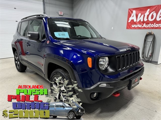 in Jetset Blue Clearcoat and Black Leather, ***CLEAN CARFAX***, **LEATHER**, **MOONROOF**, BLUETOOTH, ALL BOOKS AND KEYS, **REMOTE START**, **Back-Up Camera**, **HEATED SEATS & STEERING WHEEL**, Renegade Trailhawk, 1.3L I4, 9-Speed 948TE Automatic, 4WD, Jetset Blue Clearcoat, Black Leather, 17`` x 6.5`` Aluminum Wheels, 4 Pin Wiring Harness, 40/20/40 Rear Seat w/Trunk Pass-Thru, 4-Wheel Disc Brakes, 6 Speakers, ABS brakes, AM/FM radio: SiriusXM, Apple CarPlay/Android Auto, Auto-Dimming Rear-View Mirror, Automatic temperature control, Class III Receiver Hitch, Compass, Dual-Pane Panoramic Power Sunroof, Electronic Stability Control, Front dual zone A/C, Front fog lights, Heated door mirrors, Heated Front Seats, Heated Steering Wheel, Keyless Entry w/Panic Alarm, Leather Shift Knob, Leather Wrapped Steering Wheel, Outside temperature display, Passive Entry Remote Start Package, Power 4-Way Driver Lumbar Adjust, Power Adjust 8-Way Driver Seat, Premium Leather Group, Premium Leather Trimmed Bucket Seats, Quick Order Package 22C, Radio: Uconnect 4 w/7`` Display, Rain sensing wipers, Remote keyless entry, Roof rack: rails only, Split folding rear seat, Spoiler, Steering wheel mounted audio controls, Telescoping steering wheel, Traction control, Trailer Tow Group, Windshield Wiper De-Icer.