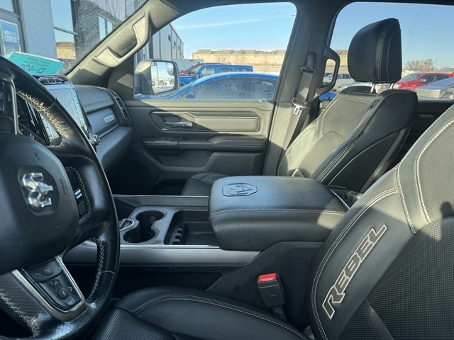 **NAVIGATION**, **LOCAL TRADE IN**, **LEATHER**, **MOONROOF**, BLUETOOTH, ALL BOOKS AND KEYS, **BED LINER**, **REMOTE START**, **Back-Up Camera**, **HEATED SEATS & STEERING WHEEL**, **APPLE CARPLAY/ ANDROID AUTO**, 1500 Rebel, 4D Crew Cab, HEMI 5.7L V8 Multi Displacement VVT, 4WD, Billet Silver Metallic Clearcoat, Black Luxury Leather Bucket Seats, 115V Auxiliary Rear Power Outlet, 12`` Touchscreen Display, 4-Wheel Disc Brakes, 9 Amplified Speakers w/Subwoofer, ABS brakes, Air Conditioning ATC w/Dual Zone Control, AM/FM radio: SiriusXM, Apple CarPlay, Auto-Dimming Exterior Driver Mirror, Blind Spot & Cross Path Detection, Compass, Dual-Pane Panoramic Sunroof, Electronic Stability Control, Fully automatic headlights, Google Android Auto, HD Radio, Heated door mirrors, Heated Front Seats, Heated Steering Wheel, Integrated Voice Command w/Bluetooth, Lux Leather Trimmed Bucket Seats, Navigation System, ParkSense Front/Rear Park Assist w/Stop, ParkView Rear Back-Up Camera, Power 8-Way Driver & Passenger Seats, Power Adjustable Pedals, Power driver seat, Power-Folding Mirrors, Radio: Uconnect 12 w/Navigation, Rain Sensitive Windshield Wipers, Rear Underseat Compartment Storage, Rear Window Defroster, Rebel 12A, Rebel Level 2 Equipment Group, Remote keyless entry, Remote Proximity Keyless Entry, Remote Start System, Speed control, Split folding rear seat, Traction control, Universal Garage Door Opener, Wheels: 18`` x 8.0`` Painted Mid-Gloss Black.